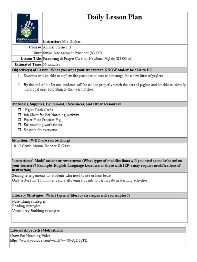 Piglet Management Lesson Plan Domestic Pig Lesson Plan