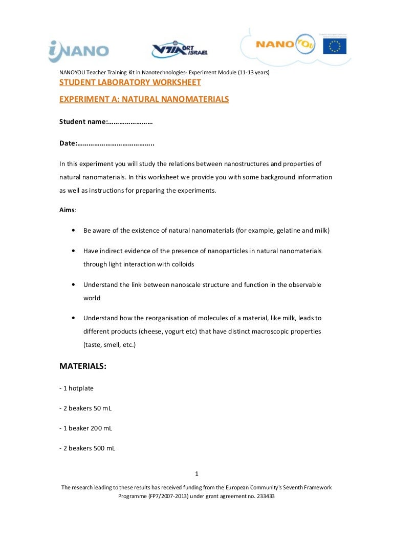 Experiment With Natural Nanomaterials Student Laboratory Worksheet