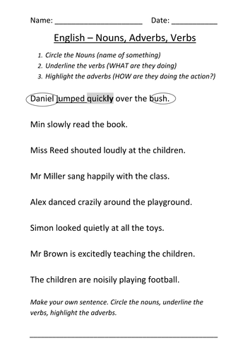 Worksheet Nouns Verbs And Adverbs By Mignonmiller Teaching Resources