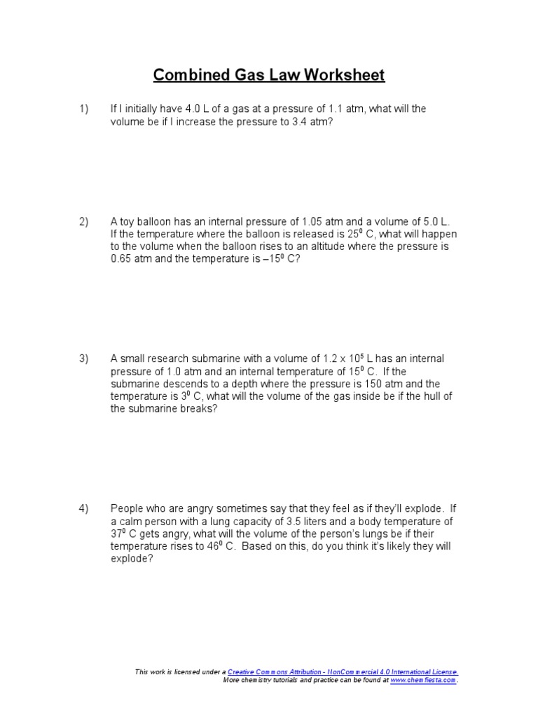 Combined Gas Law Worksheet This Work Is Licensed Under A More