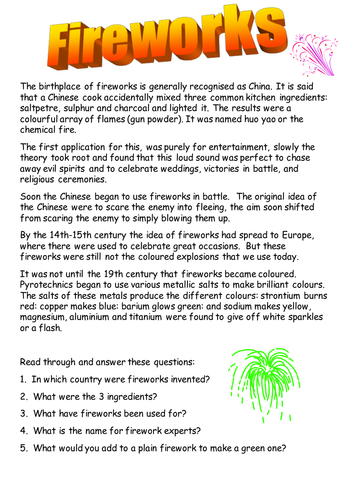 Student questions for fireworks worksheet 3. In a typical aerial burst how many explosions take place. Find out all about the history of fireworks in this history worksheet. What do you know about the science of fireworks.
